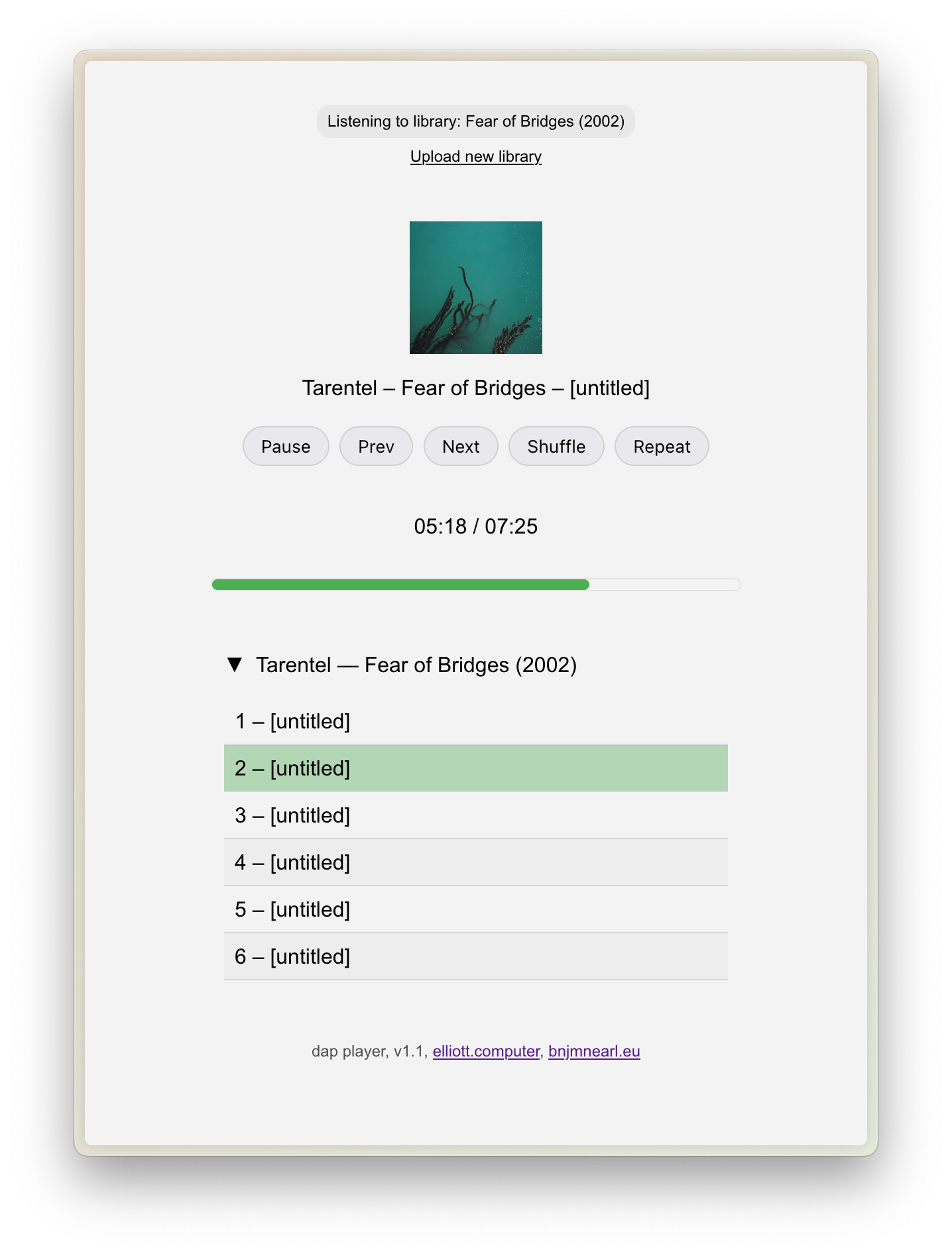 So back in 2024, when Elliott made a single page HTML music player I downloaded it and started using it to play music thats stored on my computer. Since them, I've slowly amassed a more conscious, limited library of music that I listen to in my browser. I edited the original music player to more of my liking and still bookmark it on my browser.